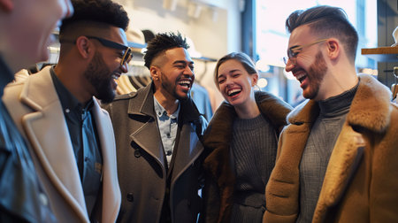 A group of friends laughing and browsing through a high-end menswear boutique, exploring fashion together.