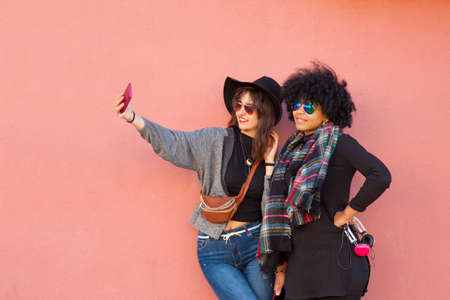Young urban people wearing sunglasses, warm clothes and wool cap posing against a concrete wall in the street
