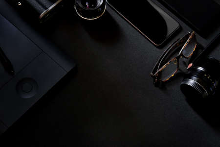 Cropped shot of digital devices with camera, smartphone, tablet, stationery and accessories on dark table
