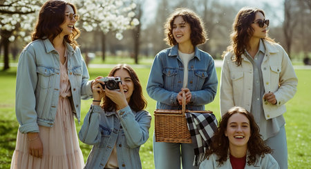 A group of six friends posing together outdoors, smiling and having fun, one person holding a camera, wearing casual jackets, with a blurred background