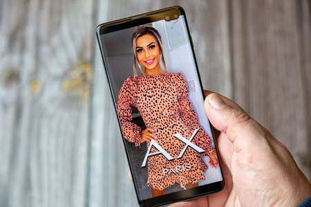 02-10-2021 Portsmouth, hampshire, UK A mobile phone or cell phone being held by a hand with the AX Paris app open on screen