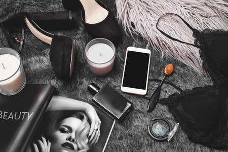 Hand use Mobile on Fashion Apparel. Top View with Woman Accessories. Trendy Clothing with Online Payments on Cell Tech