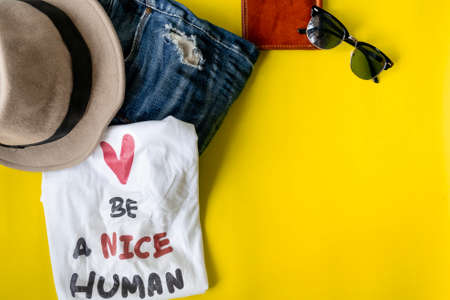 Accessories, clothes and various other men's things to collect in the journey. top view travel items on the floor for mountain trip
