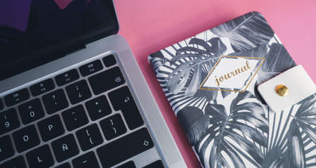 A laptop and a journal on pink background. Productivity and lifestyle concept. Handwriting.