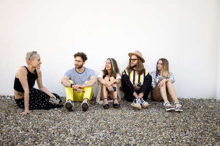 Young stylish friends talk have a close conversation, sitting together near the white wall outdoors