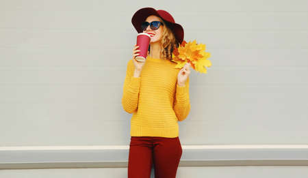 Autumn portrait of woman with yellow maple leaves and cup of coffee wearing a sweater, hat over gray background