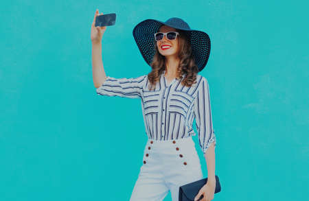 Portrait of beautiful young woman taking selfie picture by smartphone wearing a black round summer hat, white striped shirt on a blue background