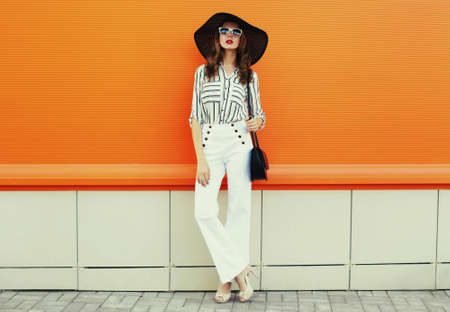 Portrait of beautiful young woman wearing a white striped shirt, black round hat on orange background