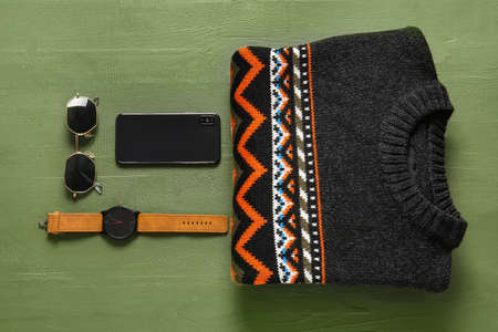 Male sweater, sunglasses, wristwatch and mobile phone on green wooden background