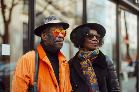 Middle aged black senior woman portrait against city street blurred background, photo of happy smiling active African American elderly lady walking in city center, AI generative image