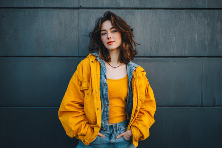 A young woman models a casual style with a yellow jacket and denim jeans during a stylish photo session in an urban environment. Natural light highlights her confident expression.