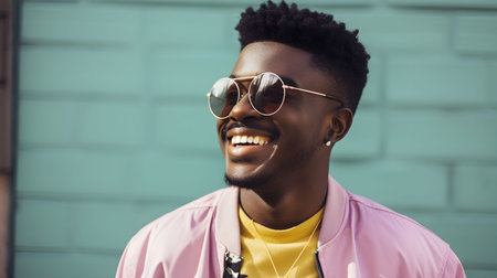An AI-generated illustration of a portrait of an African young man wearing sunglasses and smiling.