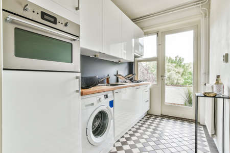built-in appliances, white kitchen cupboard. furniture for interior of house