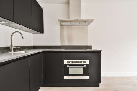 Side view of contemporary black oven, sink and kitchenware. White wood furniture with appliances and decor. bakery concept. Cozy place for cooking