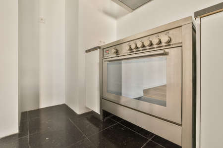 Kitchen interior in white with metal kitchen oven close-up