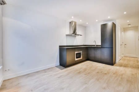 Interior of minimalist style kitchen with simple cupboards and modern appliances in light apartment