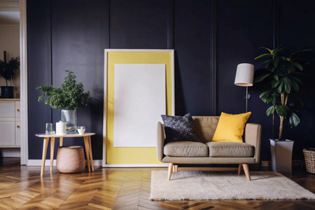 Minimal poster frame mockup in Scandinavian-style living room with wooden furniture and cozy decor
