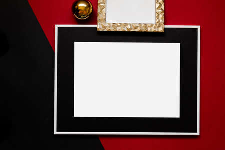 New Year's layout on a beige background: Christmas balls, branches of a Christmas tree, a gift box and a gold frame, a mockup of a postcard, an invitation.