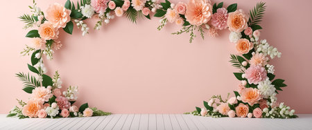 Fresh flowers and lush greenery create a beautiful arrangement along the edges of a neutral background, perfect for events or artistic displays.