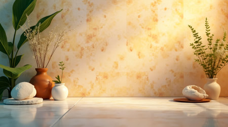 Nature-inspired decor showcases a minimalist setup featuring potted plants, clay pottery, and fresh bread, illuminated by warm, inviting light.