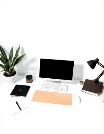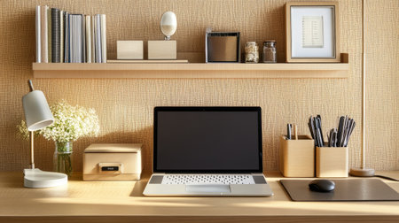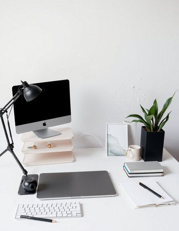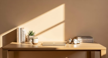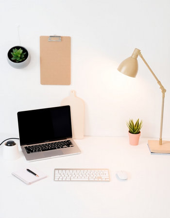 Minimalist showing minimalist desk setup with modern lamp laptop and plant in soft sunlight. resolution use.