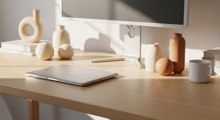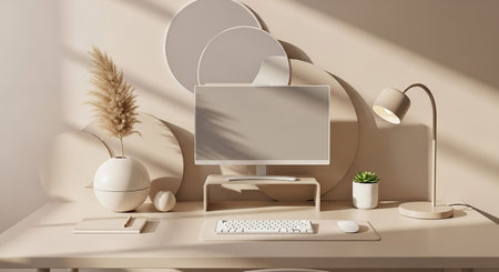 A modern desk with a computer, lamp, plant, and abstract decorative shapes in neutral tones.