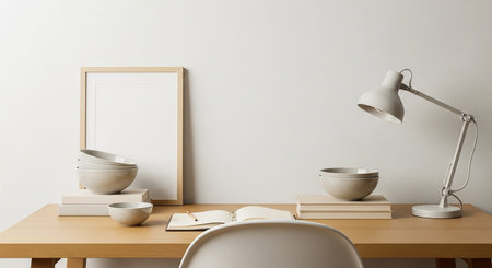 Lamp showing minimalist wooden desk with light gray lamp stacked bowls and open notebook on white wall background. resolution