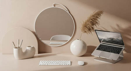 Minimalist desk with a laptop, mirror, pen holder, and dried grass in neutral tones.