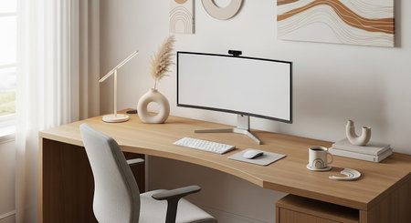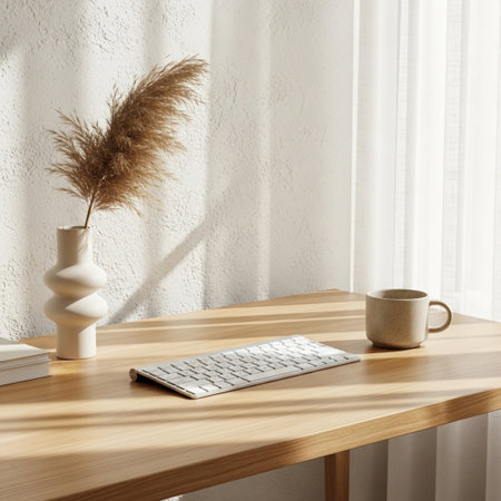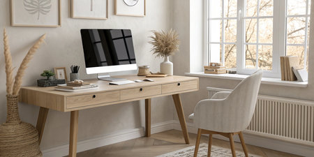Warm Minimalist Workspace – Light Wood & Natural Light