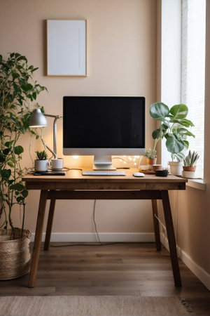 Cozy workspace with computer and houseplants in a sunlit room during the afternoon