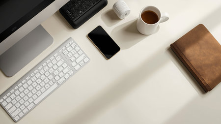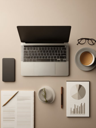 Organized workspace includes a laptop, a cup of coffee, business charts, a notebook, and a phone, providing a minimalist atmosphere for focus and productivity.