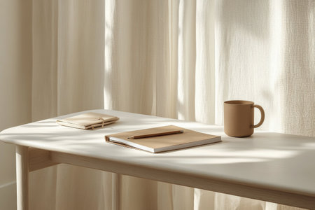 A cozy workspace is bathed in soft natural light, showcasing a cup, notebooks, and a pen on a minimalist table, creating an inviting atmosphere for productivity and creativity.