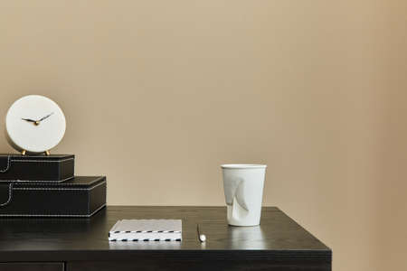 Stylish composition of office interior with black desk, cup of coffee, notes, design white clock and desk organizer. Template. Beige wall. Copy space.