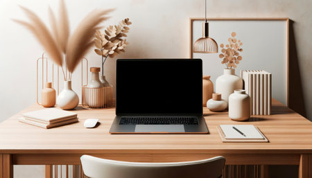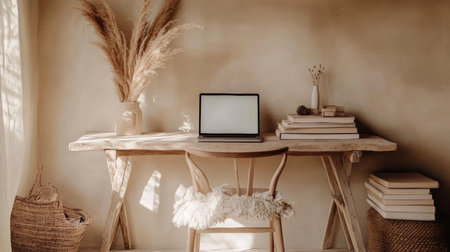 Home office interior in Boho style with wooden desk and laptop. Summer work aesthetic