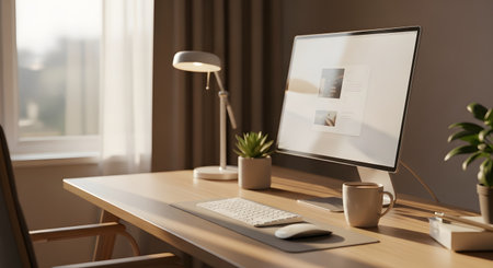 A minimalist home office setup featuring a computer monitor, keyboard, and coffee mug on a wooden desk. Warm sunlight streams through the window, creating a productive and cozy atmosphere for remote work.