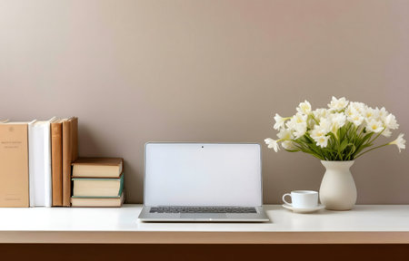 A minimalist workspace featuring a laptop, books, and a bouquet of white flowers. Calm atmosphere.