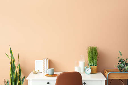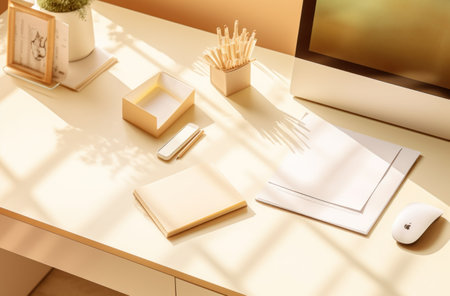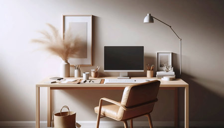 Efficiently Organized Home Office: Beige Wall Copy Space with Desk and Supplies for Productivity –AR 3:2