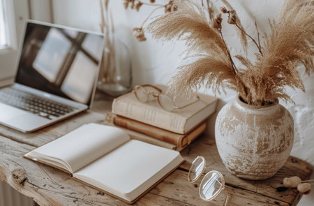 (763) showing minimalist desk setup with laptop and dried flowers in a ceramic vase on a wooden table. resolution