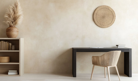 A stylish workspace showcases a simple black desk and a rattan chair, complemented by natural elements. The soft palette enhances an inviting atmosphere, ideal for productivity and creativity.