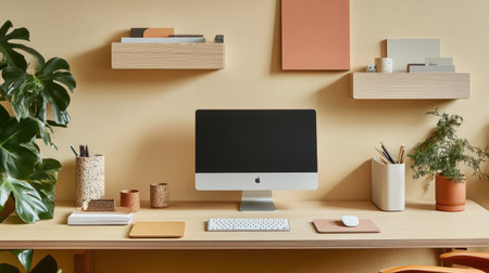 A serene and stylish minimalist workspace featuring a Mac computer on a wooden desk, complemented by warm tones, organized decor, and greenery.