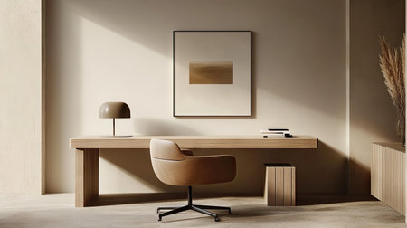 A serene and minimalist workspace featuring a wooden desk, modern chair, and abstract wall art, perfect for inspiring contemporary office design ideas.