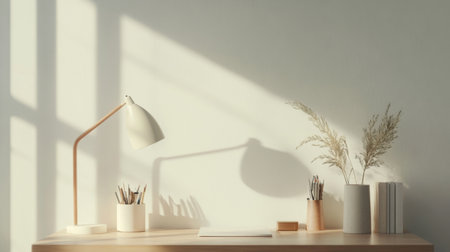 A minimalist desk with a geometric desk lamp, a clean desktop, and a few elegant stationery items, set against a light, uncluttered background.