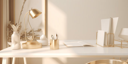 White desk with golden lamp, paper, vase and golden stationary supplies in white elegant room. Created with Generative AI technology