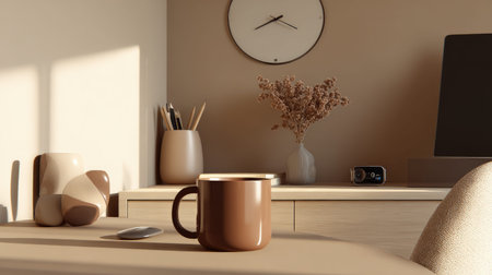 A serene workspace featuring a brown mug, a decorative vase with dried flowers, and a wall clock, all bathed in warm natural light to create a cozy atmosphere.