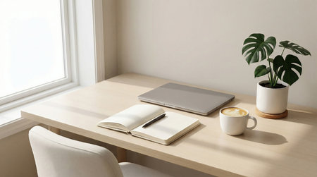 Commercial interior photography. A minimalist home office desk setup. A silver laptop, an open linen notebook with a sleek pen, and a white ceramic mug with latte art. A small potted monstera plant to the side.