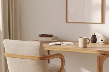 A cozy workspace features a light wood desk with a chair, an open book, and a mug. Soft natural light fills the room, enhancing the calm atmosphere of the setting.