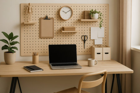 Laptop sits on a wooden desk in a minimalist home office with a pegboard organizer, stationery, and plants, creating a productive and stylish workspace