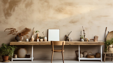 Creative composition of warm office interior with mock up poster frame, wooden desk, rattan sideboard, chair, plants in flowerpots, black ladder, pencil and personal accessories. Home decor. Template.