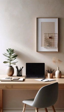 A clean and modern home office setup features a wooden desk with a laptop, a small potted tree, and a stack of books. A framed abstract print hangs on the plain white wall, embodying a minimalist and organized interior design style.