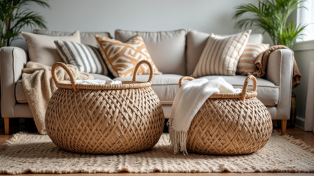 Cozy living room with wicker baskets, soft pillows, and neutral decor accents. That the image is generated using AI.